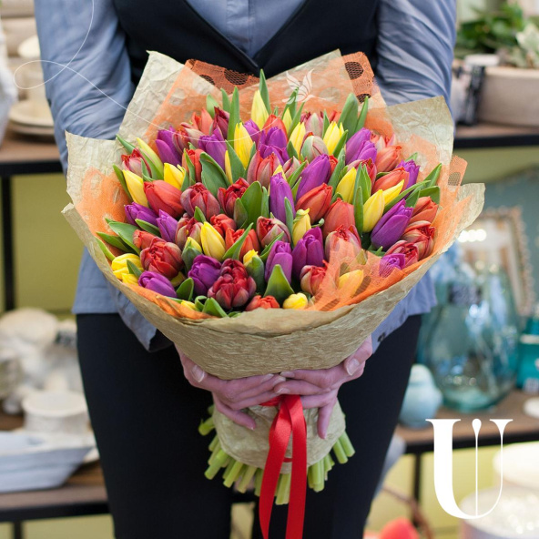 Букет из 69 тюльпанов микс и розового лагуруса в упаковке