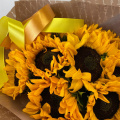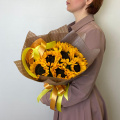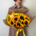 Букет из 5 коричневых хризантем и белого хлопка в матовой пленке