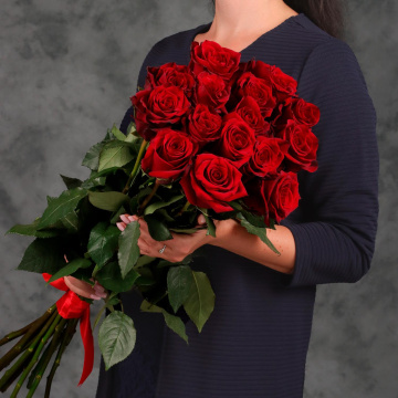 Монобукет из 15 роз сорта Ангажемент 70 см с атласной лентой