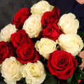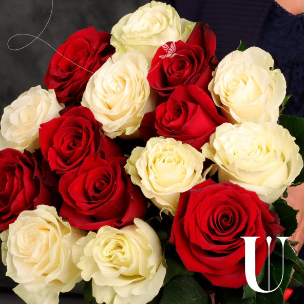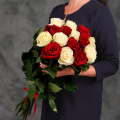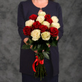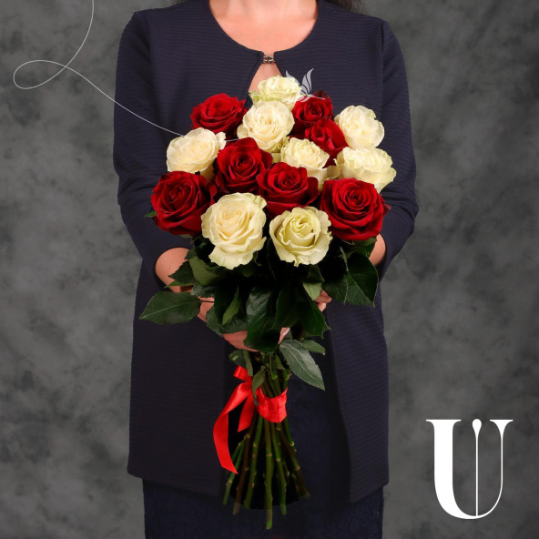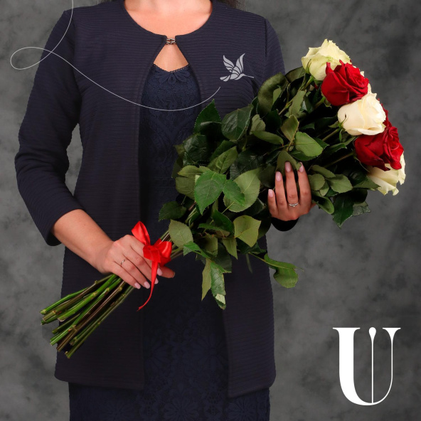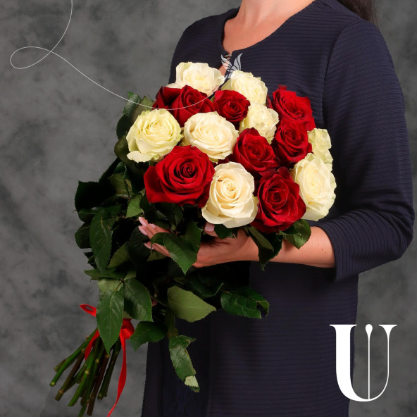 Монобукет из 51 красной и белой розы в дизайнерской упаковке