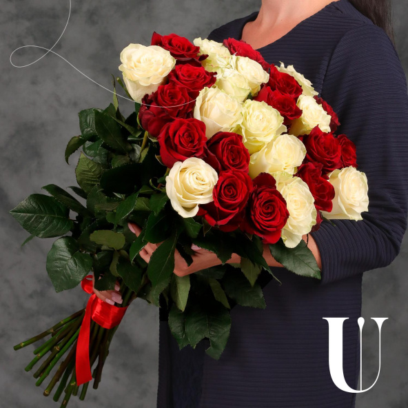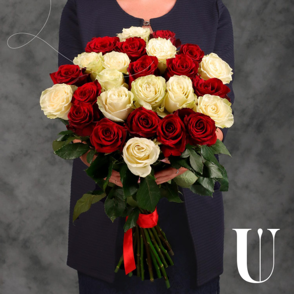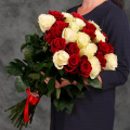 Идеальный букет из 25 роз сорта Эксплорер с атласной лентой