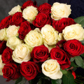 Монобукет из 51 белой розы Аваланж 70 см в черной упаковке