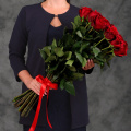 Роскошный монобукет из роз сорта Пинк Флойд с атласной лентой