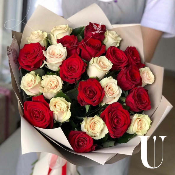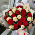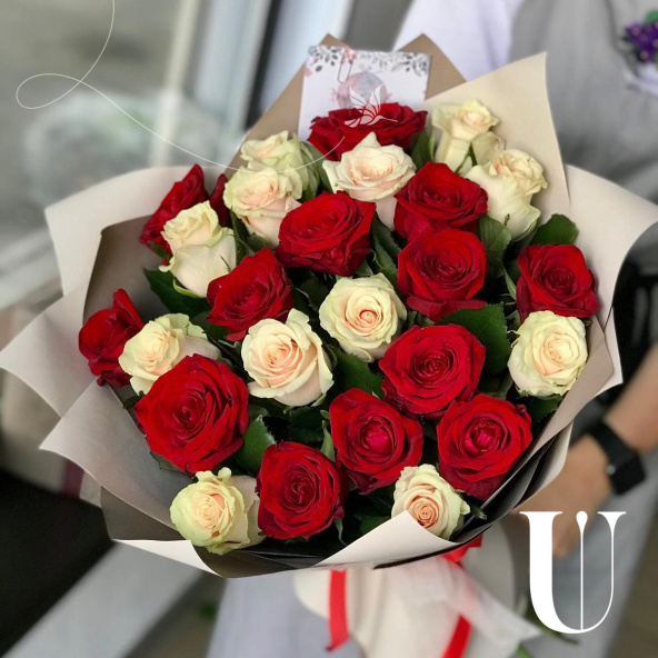 Букет из красных и белых роз в дизайнерской упаковке
