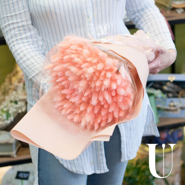 Монобукет из розовых кустовых роз сорта Лидия в упаковке