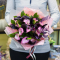 Букет из кустовых пионовидных роз Бомбастик и розовых альстромерий в упаковке