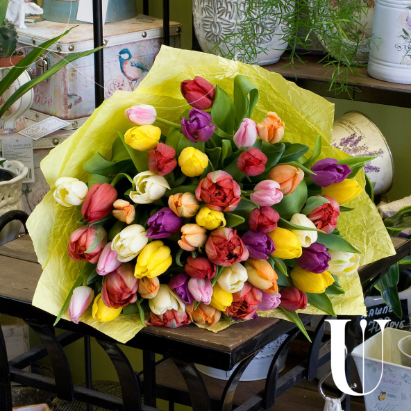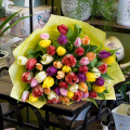 Монобукет из 49 сиреневых пионовидных тюльпанов в упаковке