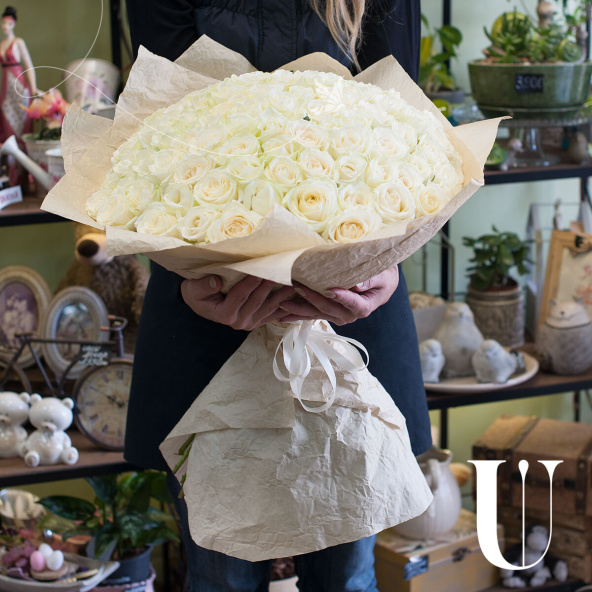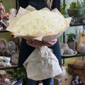 Огромный букет из 49 белых роз сорта Мондиаль в дизайнерской упаковке