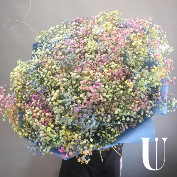 Так выглядит букет-единорог! Здесь 25 веточек гипсофилы и он похож на разноцветное облако! Яркий, большой, пушистый, стойкий букет - вы уже знаете, что хотите его! Мы перевяжем букет атласными лентами, упакуем в красивую бумагу и приложим карточку от вашего имени. К каждому букету прилагается инструкция по уходу и подкормка, продлевающая жизнь цветов. Упаковка может отличаться от представленной на фото, но будет однозначно подходить букету