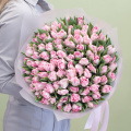 Большой букет из 101 коралловой розы в нежно-розовой упаковке