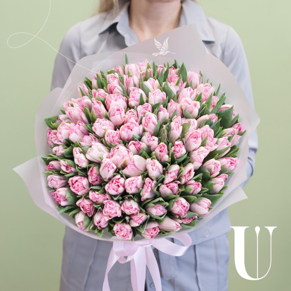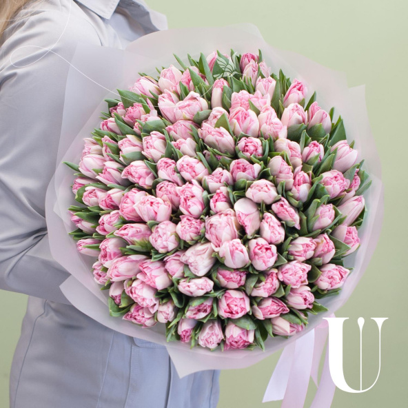 Букет из тюльпанов сорта Сара Бернар и малиновых тюльпанов в упаковке