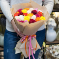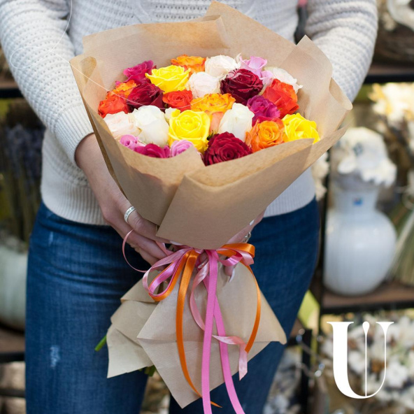 Монокомпозиция из кустовых роз в дизайнерской упаковке