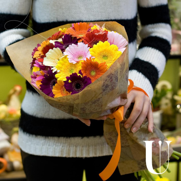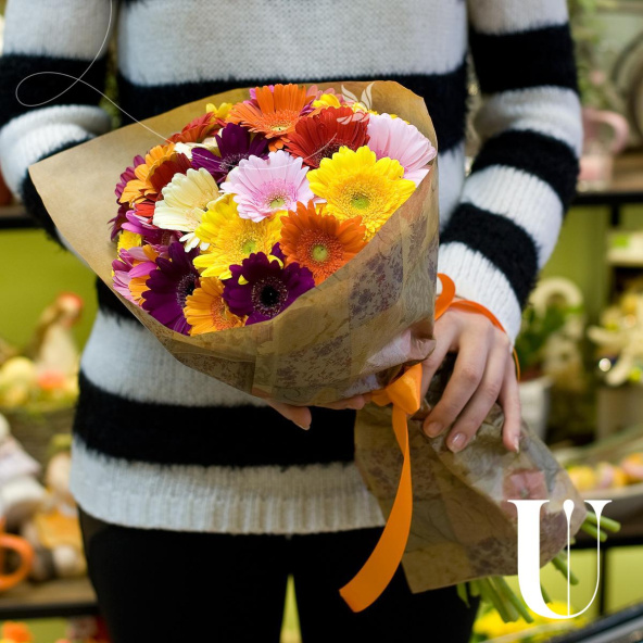 Монобукет из 15 розовых гермини в дизайнерской упаковке