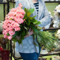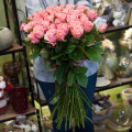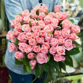 Букет из нежно-розовых кустовых пионовидных роз сорта Мисс Бомбастик 50 см в розовой упаковке