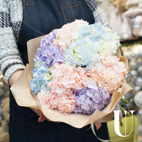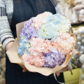 Монобукет из 3 гортензий микс и гипсофилы в упаковке