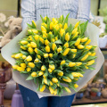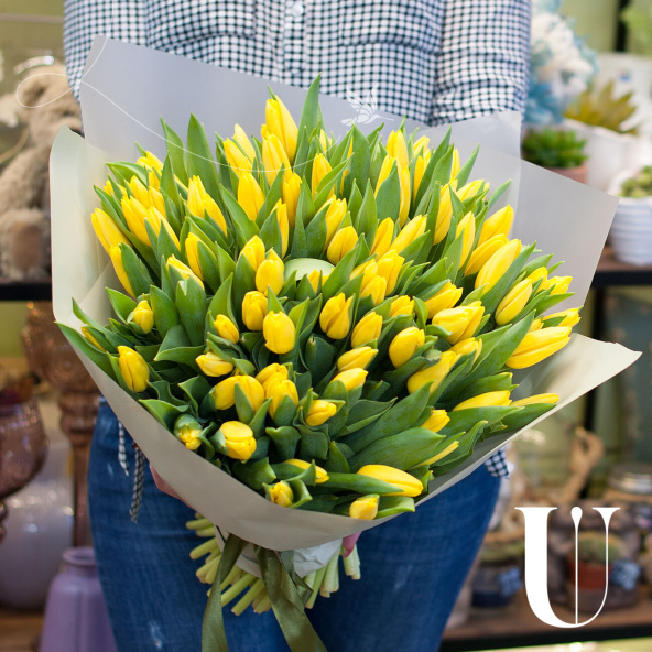 Букет состоит из 101 желтого тюльпана, что делает его ярким и запоминающимся. Тюльпаны - символ весны и радости, они добавят в ваш подарок тепло и нежность.