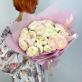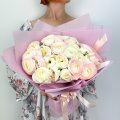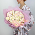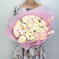 Букет из роз Пинк Охара и кустовых пионовидных роз Мисти Бабблз в упаковке