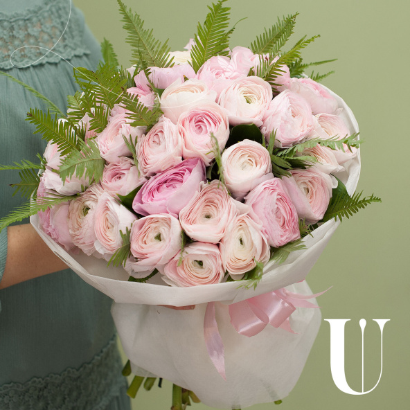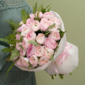 Монобукет из 23 розовых пионов и ромашки Камила в упаковке