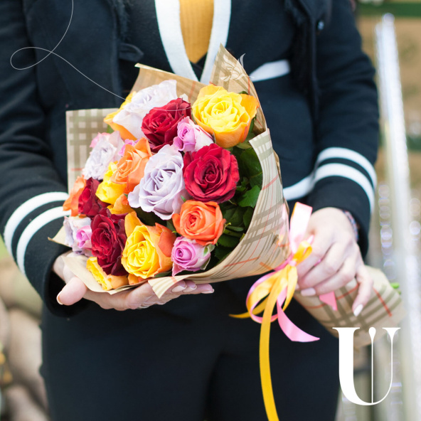 Монобукет из 11 роз микс и салала в упаковке
