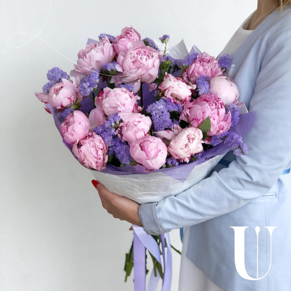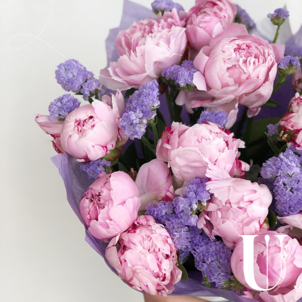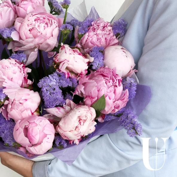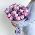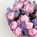 Букет из розовых пионов и лаванды в крафтовой упаковке