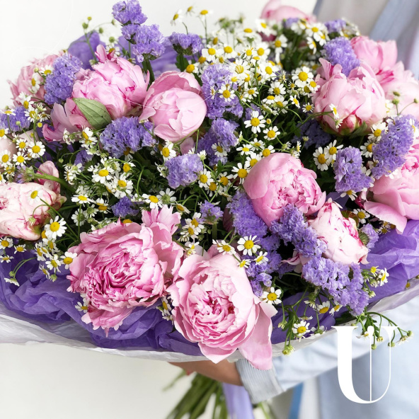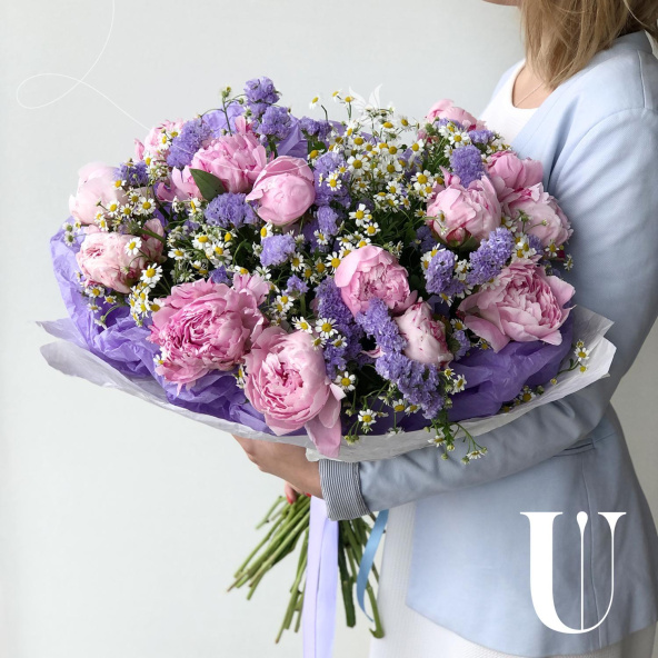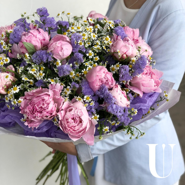 Монобукет из 20 розовых пионов и ромашки в розовой упаковке