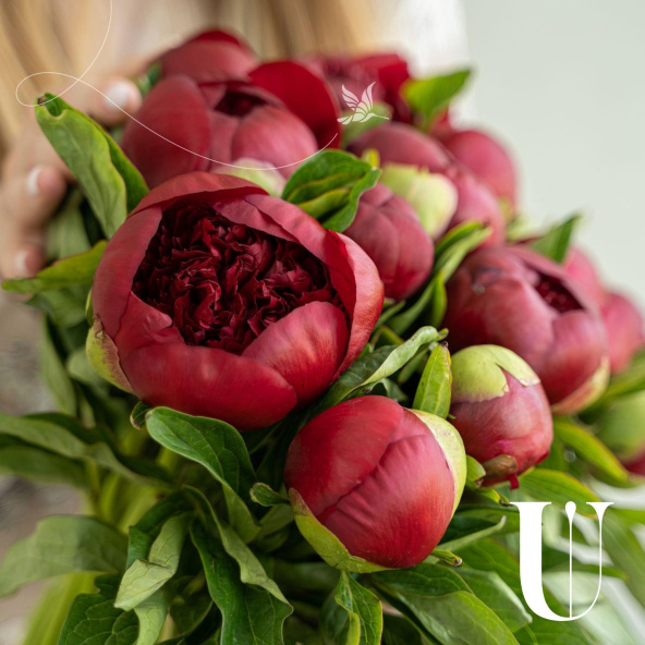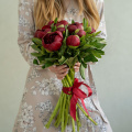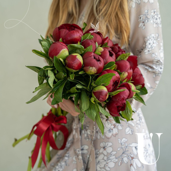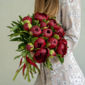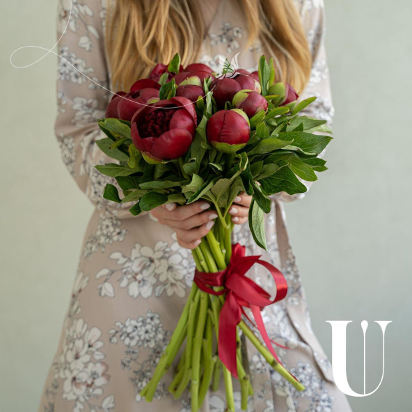 Монобукет из 9 пионов сорта Сара Бернар в дизайнерской упаковке