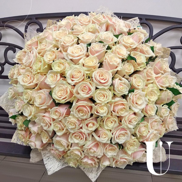 Большой букет из 101 розовой розы сорта Аква в упаковке