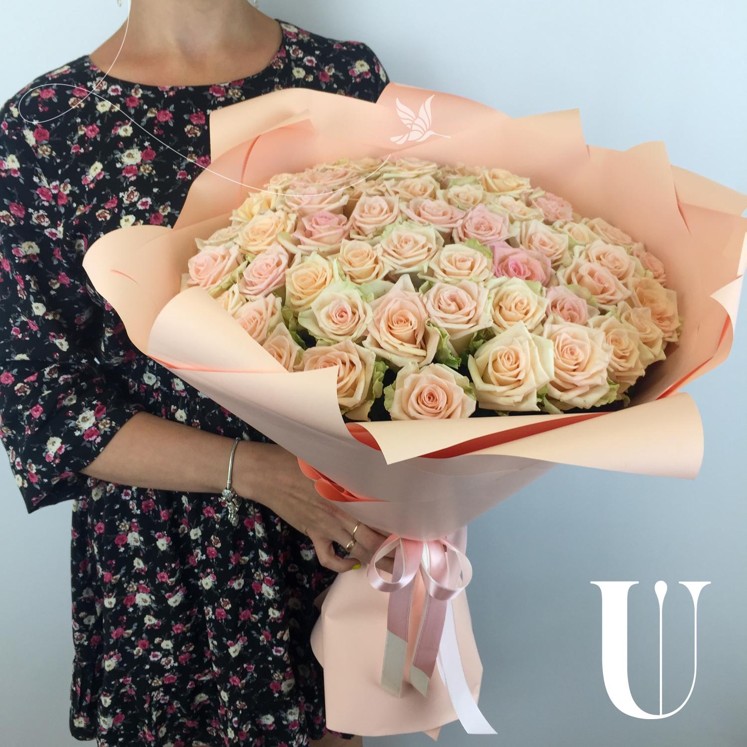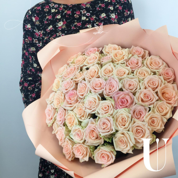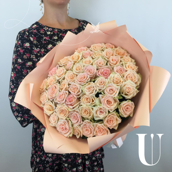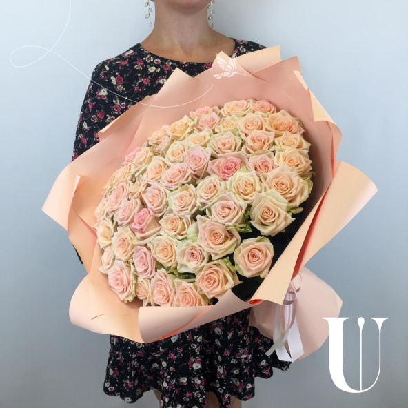 Большой букет из 51 кремовой розы сорта Шармант в дизайнерской упаковке