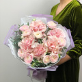 Букет из розовых кустовых пионовидных роз в упаковке