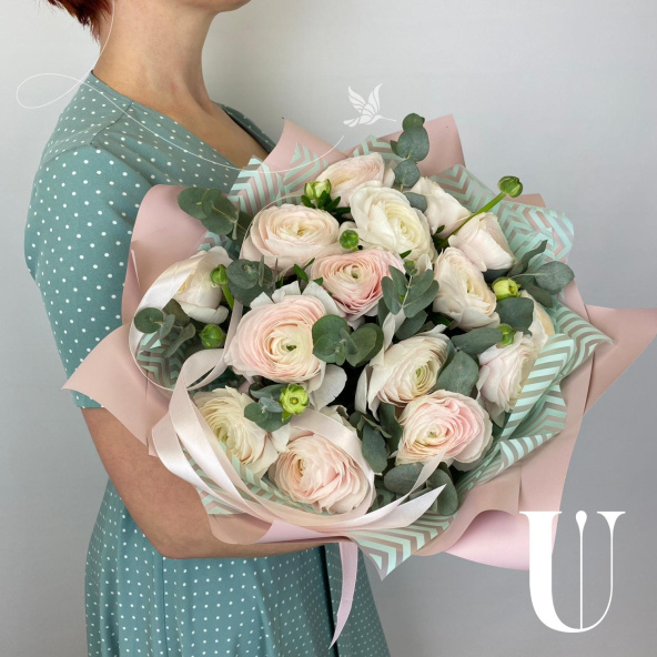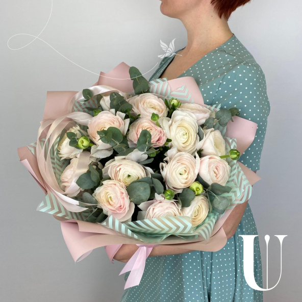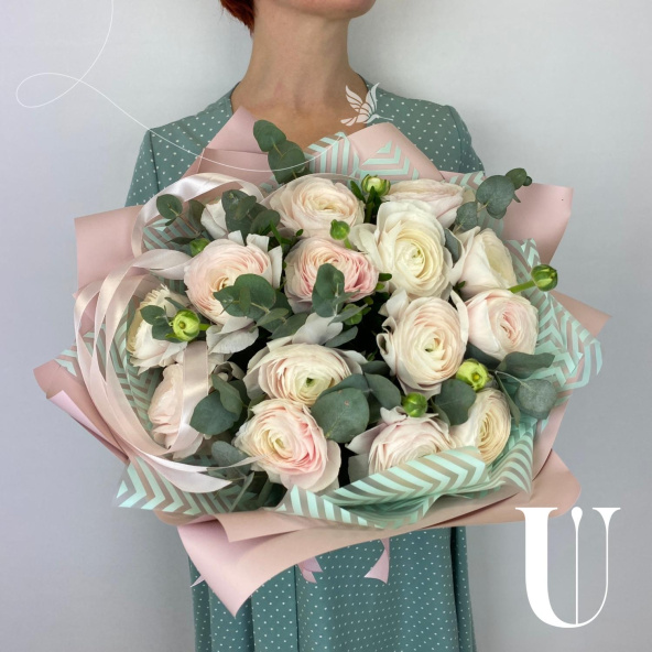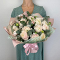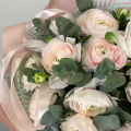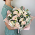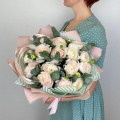 Монобукет из розовых кустовых пионовидных роз в упаковке