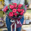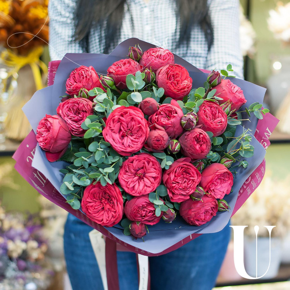 Букет состоит из 17 пионовидных красных роз, которые придают ему неповторимый шарм и элегантность. Красные розы - символ любви и страсти, они всегда будут уместны и желанны.