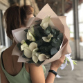 Букет из белых пионовидных роз и нежных кустовых роз в упаковке