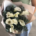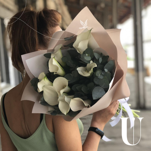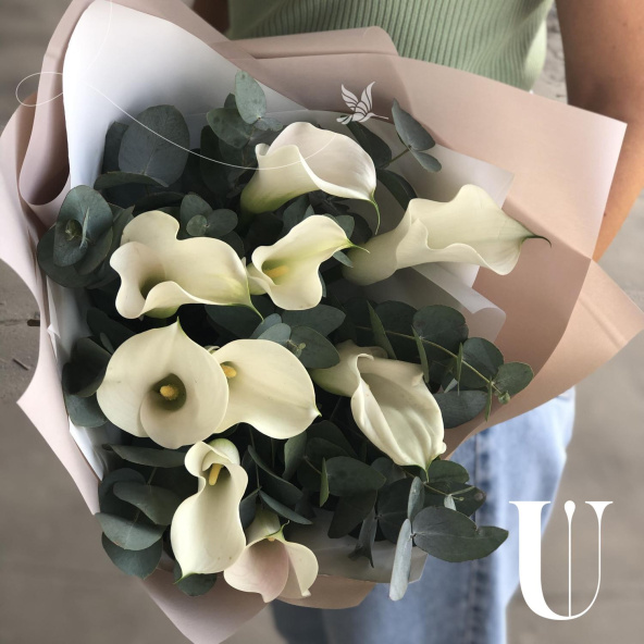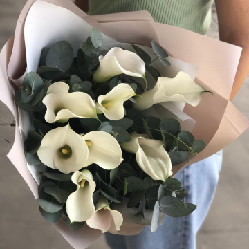 Чарующий букет из каллы и эвкалипта станет стильным подарком на любое торжество