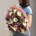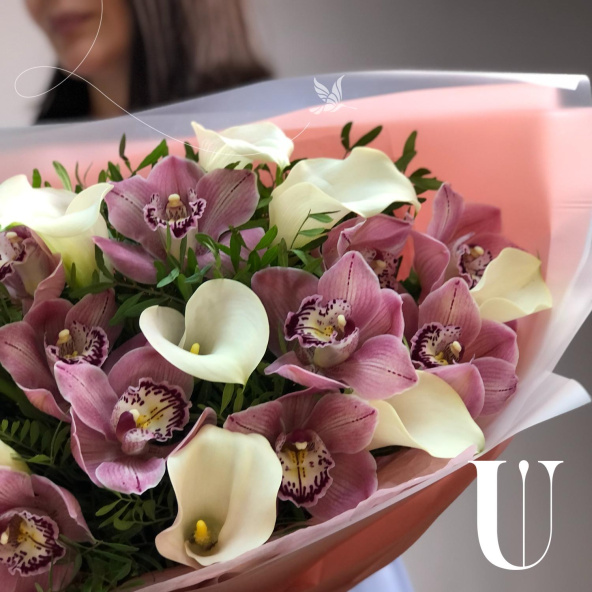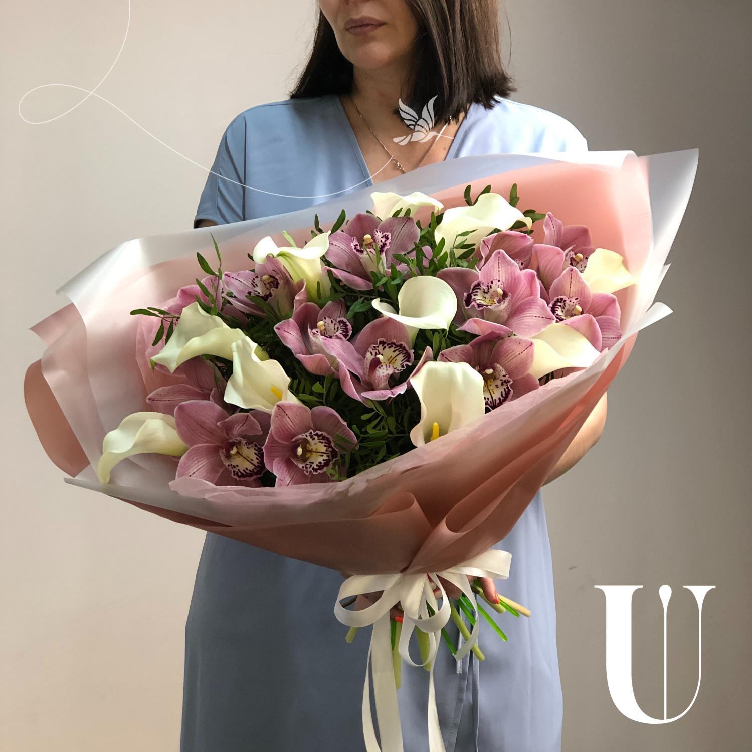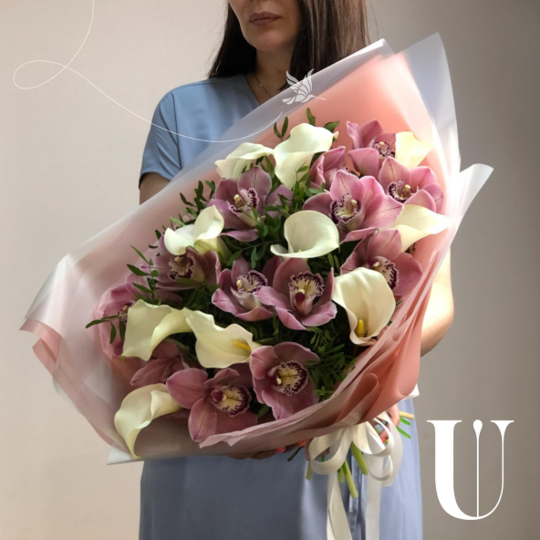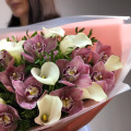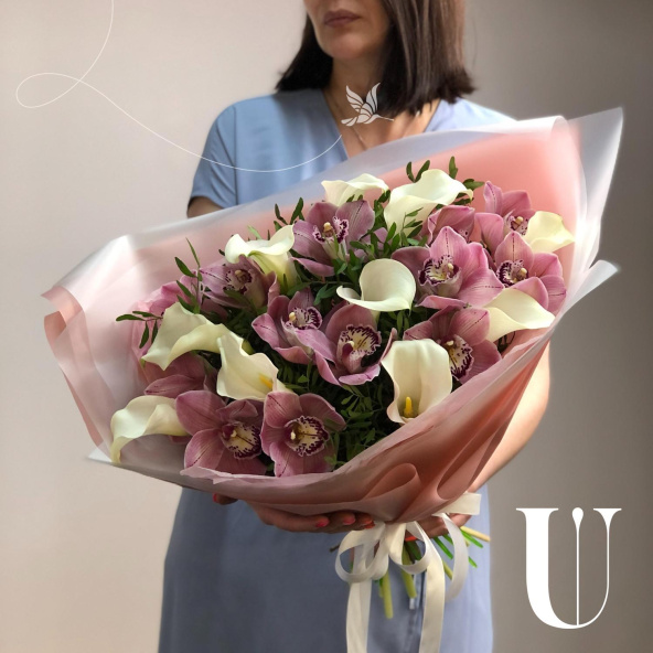 Изысканная композиция из орхидей и калл непременно порадует получателя