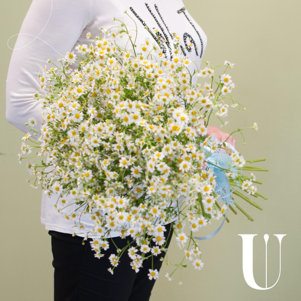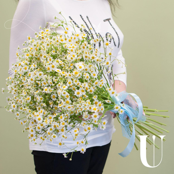 Букет состоит из 25 ромашек, которые являются символом любви и нежности. Благодаря этому, букет "Ромашкино" будет выглядеть свежо и актуально.