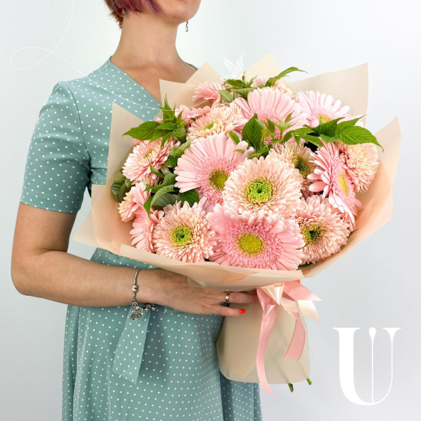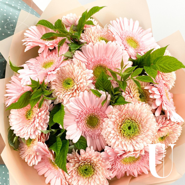 Монобукет из 9 розовых хризантем в упаковке