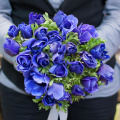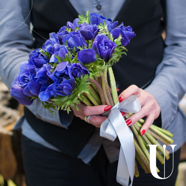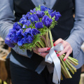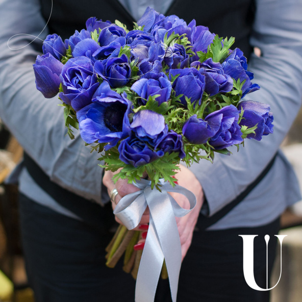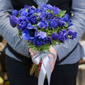 Монобукет из 49 белых тюльпанов в голубой упаковке