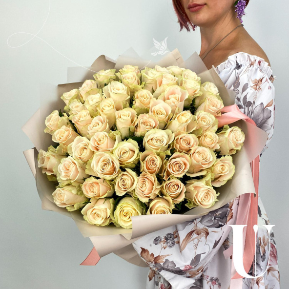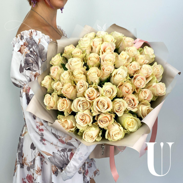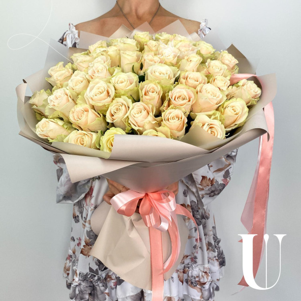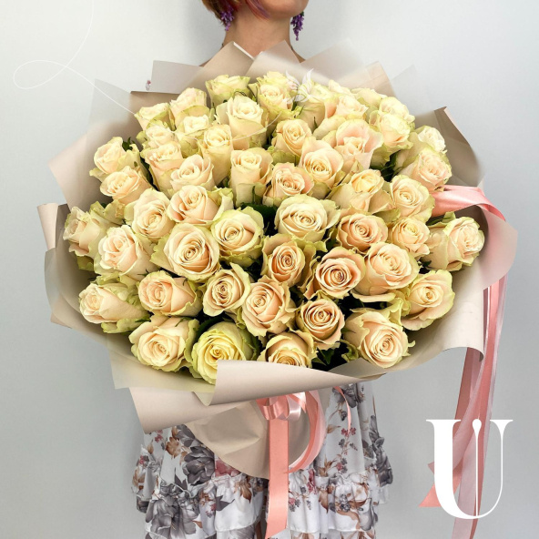 Монобукет из 51 розы сорта Атена в дизайнерской упаковке