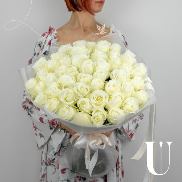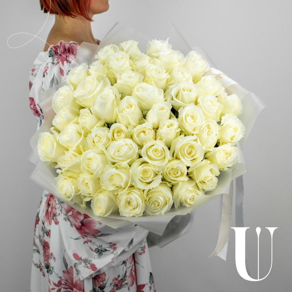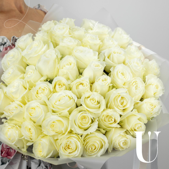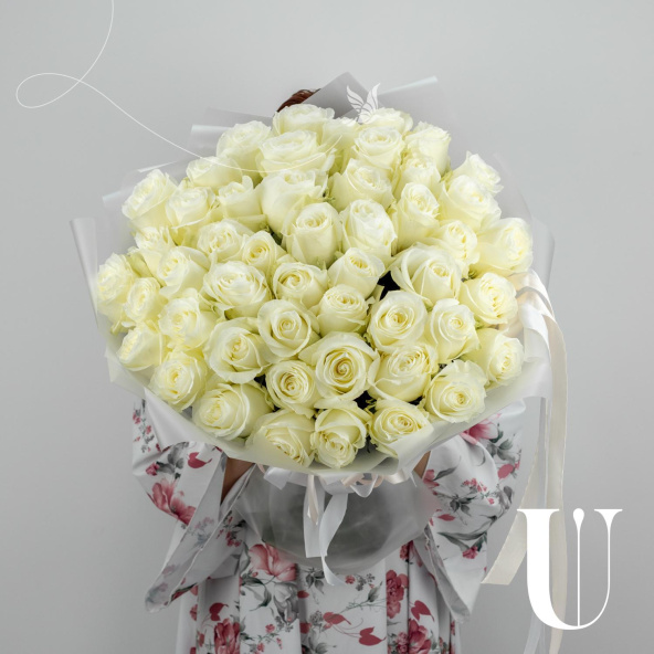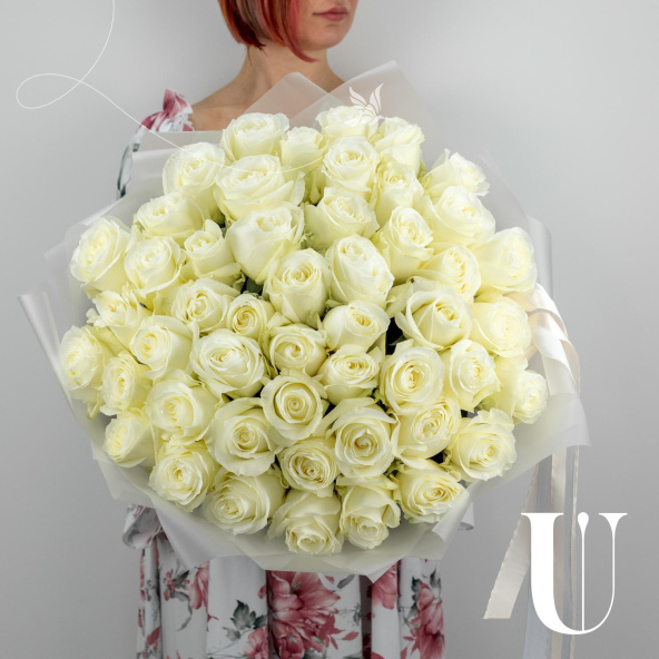 Огромный букет из 49 белых роз сорта Мондиаль в дизайнерской упаковке