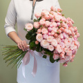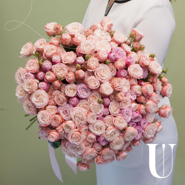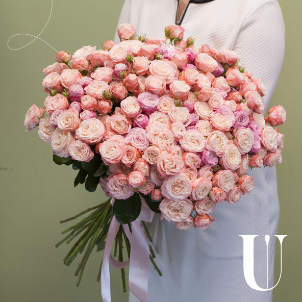 Большой букет из кустовых пионовидных роз Мисти Бабблз в упаковке