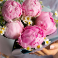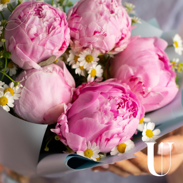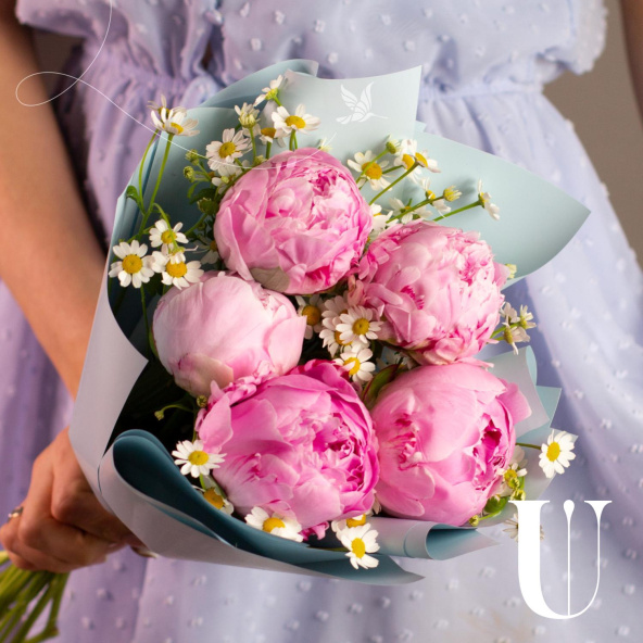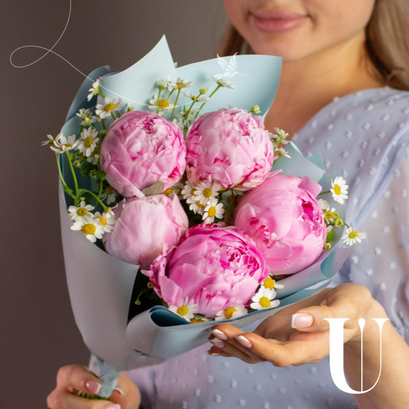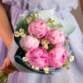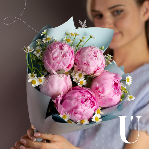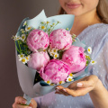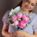 Монобукет из 5 коралловых пионов в стильной упаковке