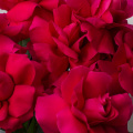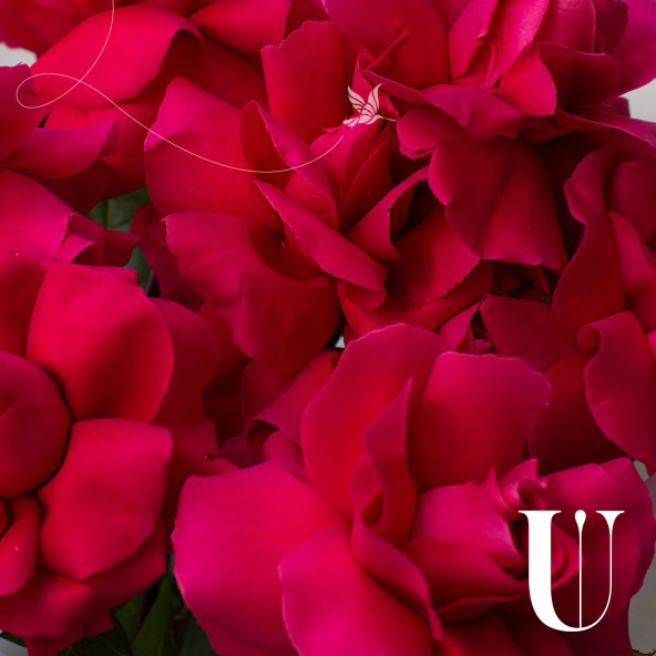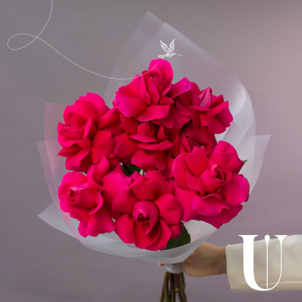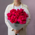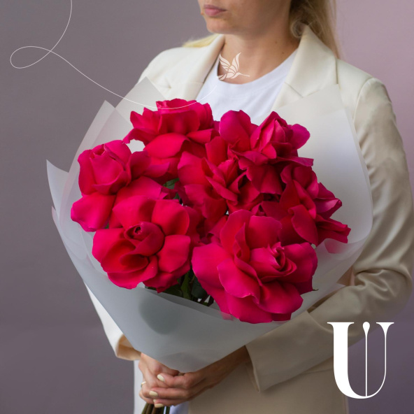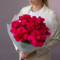 Монокомпозиция из малиновых роз в бежевой упаковке