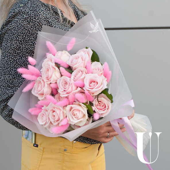 Букет выполнен в нежном розовом цвете, который символизирует любовь, нежность и заботу. Этот оттенок цветов будет уместен на любом празднике, будь то день рождения, юбилей, свадьба или годовщина.