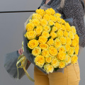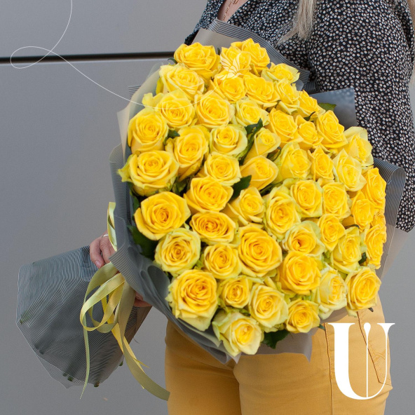 Букет состоит из 49 желтых роз, собранных на стеблях. Это придает букету объем и пышность, делая его ярким и запоминающимся.