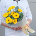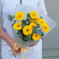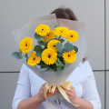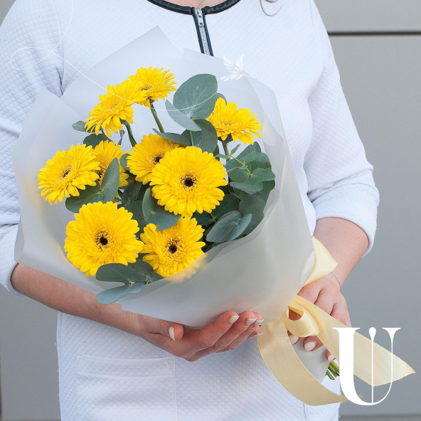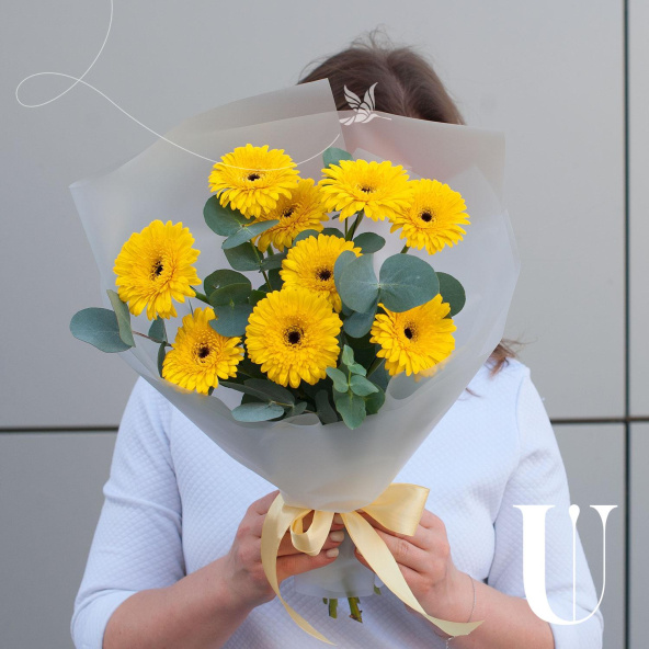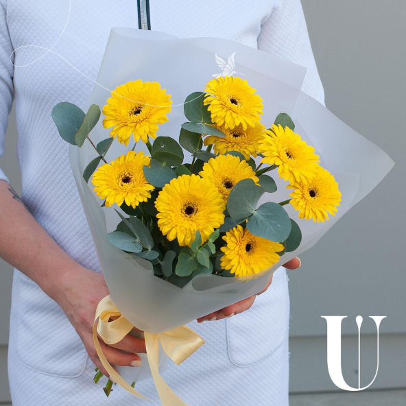 Букет состоит из 9 минигербер желтого цвета, что придает ему неповторимый и яркий вид. Минигерберы - это маленькие, но очень красивые цветы, которые прекрасно сочетаются с ветвями эвкалипта.