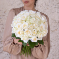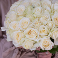 Монобукет из 101 розы сорта Аваланж в голубой упаковке