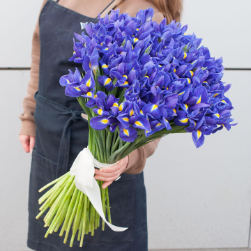 Букет состоит из 101 ириса, что делает его ярким и запоминающимся. Ирисы синего цвета, что придает букету глубину и насыщенность.