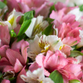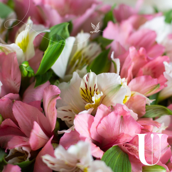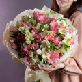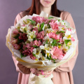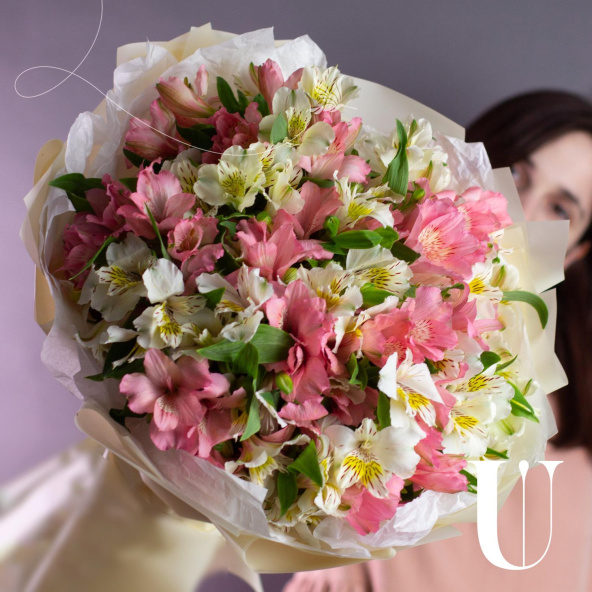 Букет из белых роз Аваланж 60 см и розовых кустовых роз Лидия 60 см в дизайнерской упаковке