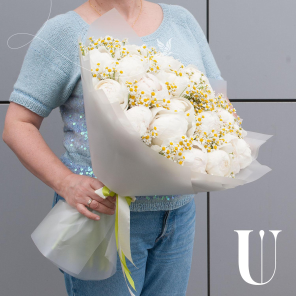 Букет состоит из белых пионов, которые символизируют чистоту и невинность, а также нежность и любовь. Мелкая ромашка добавляет композиции легкости и свежести.