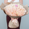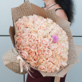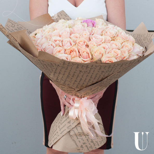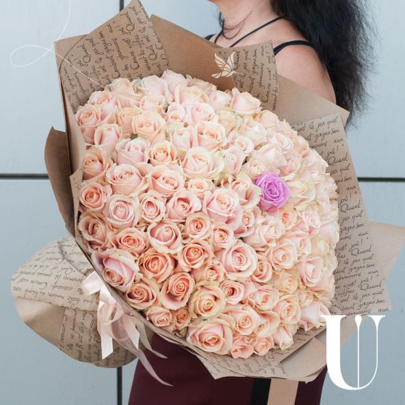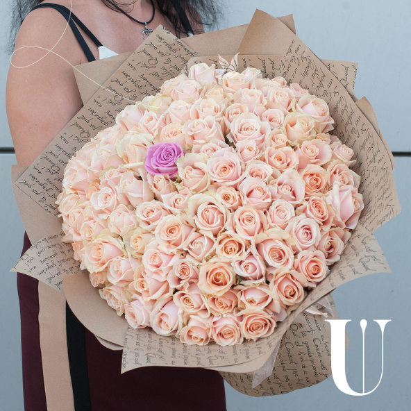 Букет состоит из 101 цветка, включая 100 персиковых роз и одну розовую розу. Такой состав цветов делает букет ярким и запоминающимся.